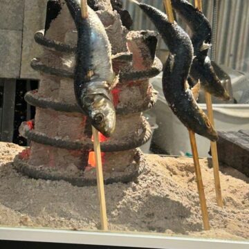 目の前にて炭火で焼く原始焼きや刺身などの一品を堪能