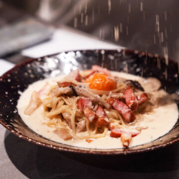 自慢の揚げたてカルボナーラは、サクサクのライスコロッケに温泉卵を混ぜて味わう自慢の逸品です。