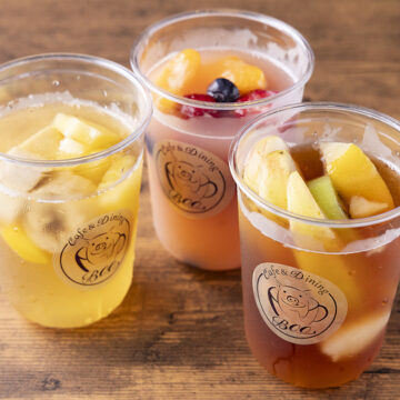 朝は、選べるパンセットやおにぎりとお味噌汁の日替わりモーニングで、一日のスタートを美味しくサポート♪こだわりのドリンクも充実し、紅茶やココア、レモンスカッシュに加え、ゴロゴロ果実がたっぷり入った自慢のフルーツジュースも楽しめます。