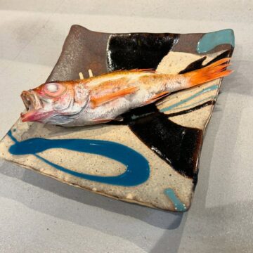 目の前にて炭火で焼く原始焼きや刺身などの一品を堪能