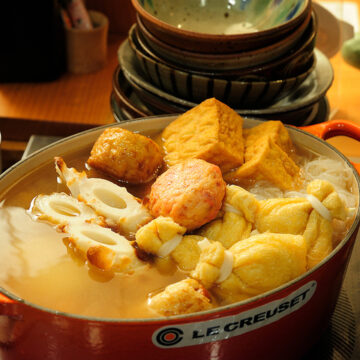 ジューシーな厚揚げや、放牧牛の旨みたっぷりの牛すじなど、こだわりの具材を優しい薄味だしでじっくり煮込みました。